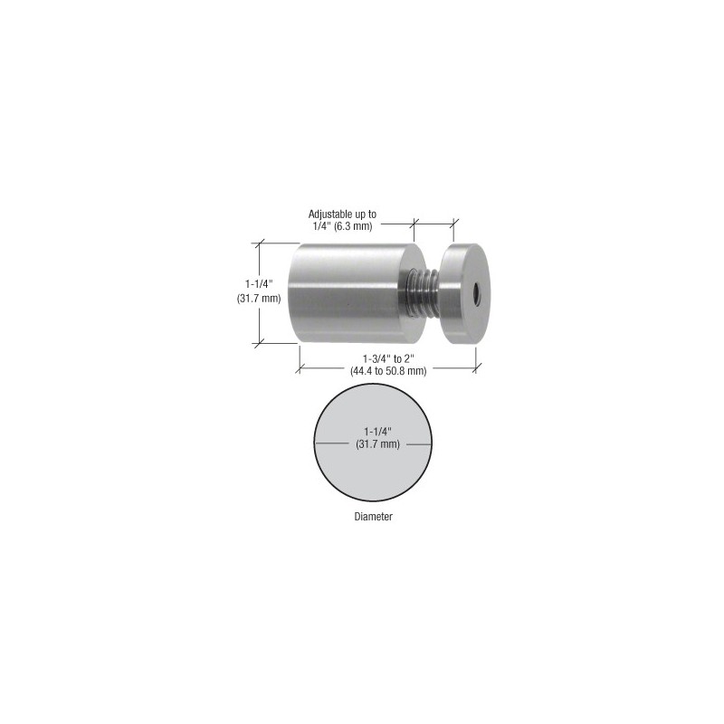 The CRL Adjustable Standoff is primarily designed for use on uneven walls or surfaces. When the adjustment collar is in the compressed position the base measures 1-3/4" (44.5 mm) in length. When the collar is backed out an additional 1/4" (6 mm) is gained for a 2" (51 mm) length. Any length in-between is possible simply by rotating the collar to the desired measurement and securing it with the Allen set screw. Panels require a 5/8" (16 mm) hole for assembly. Does not include a Cat. No. CAP114BS Standoff Cap. Designed to be used with our 1-1/4" (32 mm) Diameter Standoff components.