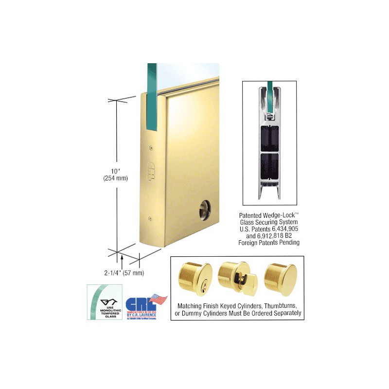 DR10SPB12SL CRL Polished Brass 1/2" Glass 10" Square Door Rail With Lock - 35-3/4" Length