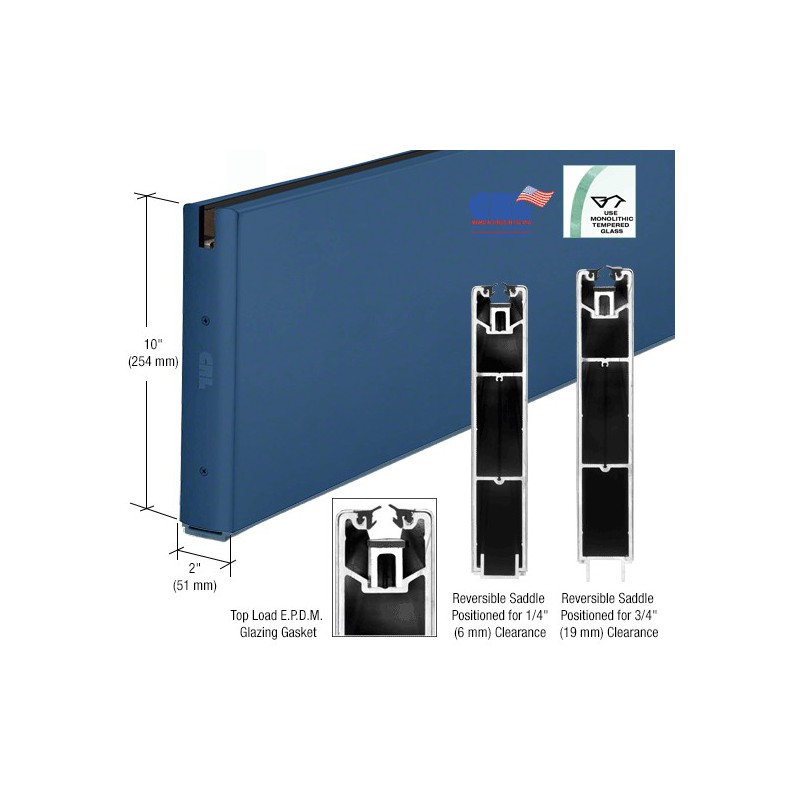 The CRL 10" (254 mm) Square Sidelite Rail is commonly used in office and storefront applications to secure fixed glass panels. Since the profile matches our Door Rails, these Sidelite Rails can be used top and bottom for a matching look, or with a variety of smaller configuration U-Channels. Glass is installed easily with the 'lift and drop' method using our 4" (102 mm) Aluminum and Neoprene Setting Blocks. Glass is secured with a Top Load EPDM Roll-in Glazing Gasket that eliminates the messy application of silicone sealant.