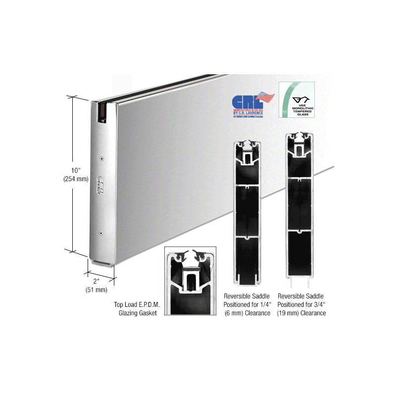 The CRL 10" (254 mm) Square Sidelite Rail is commonly used in office and storefront applications to secure fixed glass panels. Since the profile matches our Door Rails, these Sidelite Rails can be used top and bottom for a matching look, or with a variety of smaller configuration U-Channels. Glass is installed easily with the 'lift and drop' method using our 4" (102 mm) Aluminum and Neoprene Setting Blocks. Glass is secured with a Top Load EPDM Roll-in Glazing Gasket that eliminates the messy application of silicone sealant.