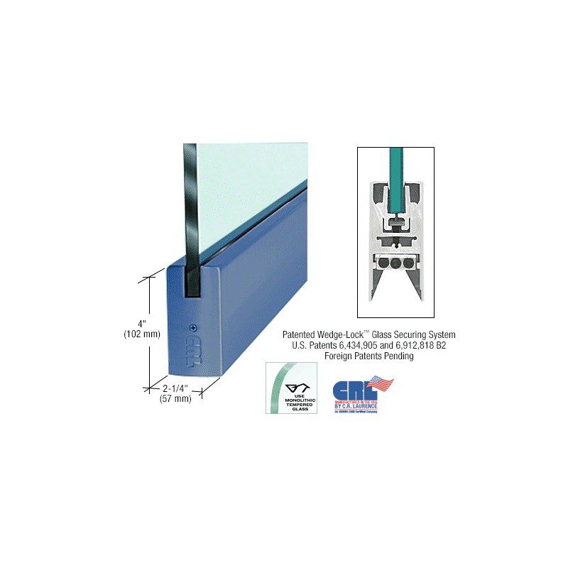 Our innovative glass entrance system, the CRL Wedge-Lock® Door Rail System features the exclusive CRL Wedge-Lock® Securing System (U.S. Patents 6,434,905 and 6,912,818 B2, Canadian Patent 2,419,706, and European Patent No. EP 1 404 939 B1). A totally new concept for securing the glass in the door rail. It works by applying pressure from the bottom of the door rail, using two glass retaining aluminum extrusions via a flat stainless steel bar. As this bar is pulled down with socket head cap bolts, pressure is applied to the glass retaining aluminum extrusions. The bottom of the extrusions are at an angle and fit into an angled groove in the door rail. As the glass retaining extrusions are being pulled down, the angled wedge in the door rail also pulls the glass retaining extrusions together. This action, along with our specially designed door retaining gasket, creates a tremendous amount of force (more than 900 lbs.) in our 9" (228.6 mm) Corner Rail. That's 100 lbs. per inch. Imagine how much force is created in our full length 35-3/4" (908 mm) Door Rails!