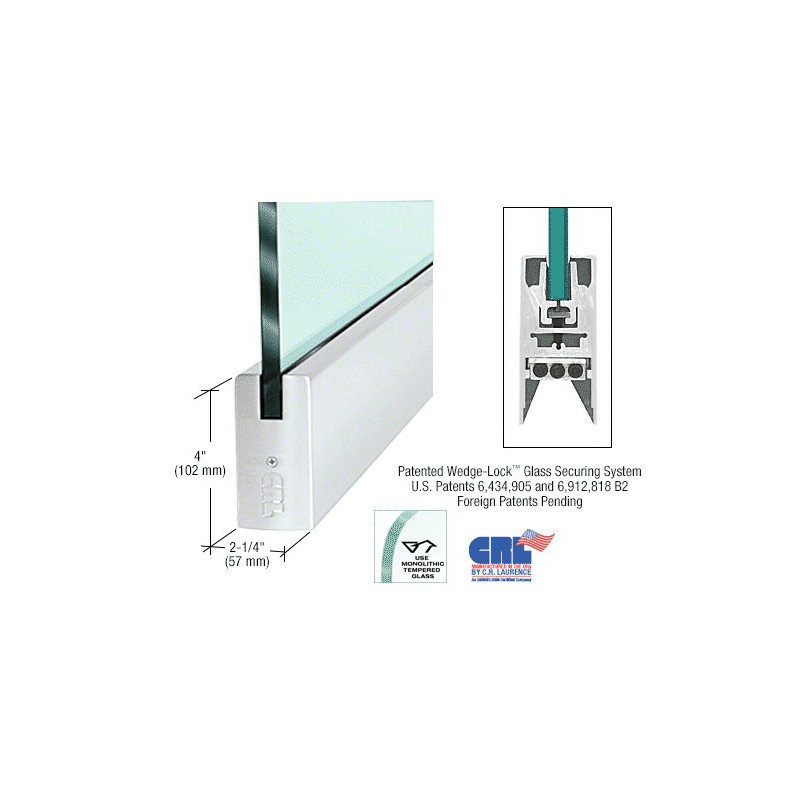 Our innovative glass entrance system, the CRL Wedge-Lock® Door Rail System features the exclusive CRL Wedge-Lock® Securing System (U.S. Patents 6,434,905 and 6,912,818 B2, Canadian Patent 2,419,706, and European Patent No. EP 1 404 939 B1). A totally new concept for securing the glass in the door rail. It works by applying pressure from the bottom of the door rail, using two glass retaining aluminum extrusions via a flat stainless steel bar. As this bar is pulled down with socket head cap bolts, pressure is applied to the glass retaining aluminum extrusions. The bottom of the extrusions are at an angle and fit into an angled groove in the door rail. As the glass retaining extrusions are being pulled down, the angled wedge in the door rail also pulls the glass retaining extrusions together. This action, along with our specially designed door retaining gasket, creates a tremendous amount of force (more than 900 lbs.) in our 9" (228.6 mm) Corner Rail. That's 100 lbs. per inch. Imagine how much force is created in our full length 35-3/4" (908 mm) Door Rails!