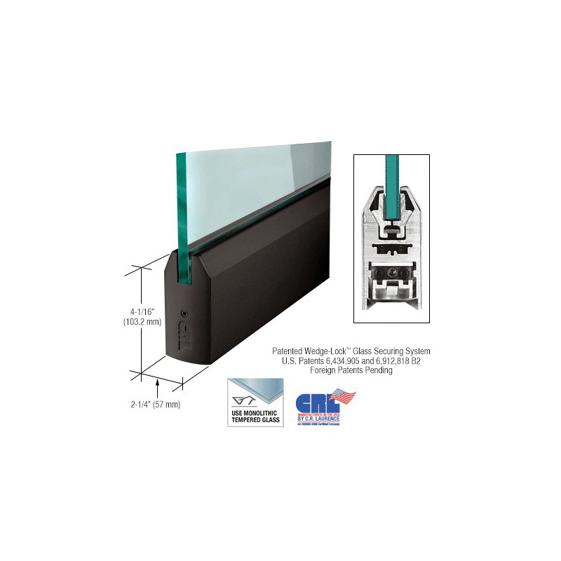 Our innovative glass entrance system, the CRL Wedge-Lock® Door Rail System features the exclusive CRL Wedge-Lock® Securing System (U.S. Patents 6,434,905 and 6,912,818 B2, Canadian Patent 2,419,706, and European Patent No. EP 1 404 939 B1). A totally new concept for securing the glass in the door rail. It works by applying pressure from the bottom of the door rail, using two glass retaining aluminum extrusions via a flat stainless steel bar. As this bar is pulled down with socket head cap bolts, pressure is applied to the glass retaining aluminum extrusions. The bottom of the extrusions are at an angle and fit into an angled groove in the door rail. As the glass retaining extrusions are being pulled down, the angled wedge in the door rail also pulls the glass retaining extrusions together. This action, along with our specially designed door retaining gasket, creates a tremendous amount of force (more than 900 lbs.) in our 9" (228.6 mm) Corner Rail. That's 100 lbs. per inch. Imagine how much force is created in our full length 35-3/4" (908 mm) Door Rails!