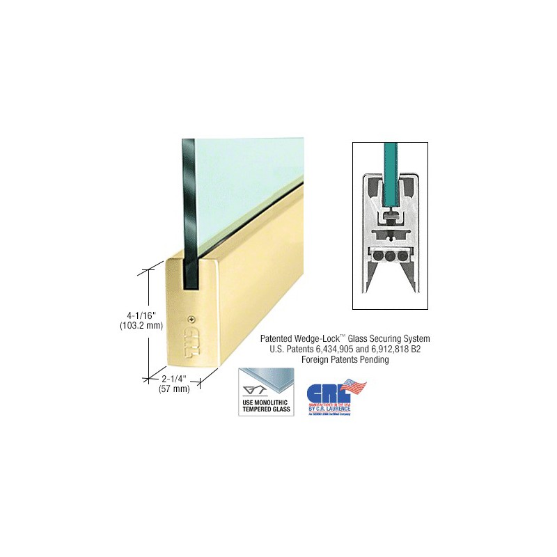 Our innovative glass entrance system, the CRL Wedge-Lock® Door Rail System features the exclusive CRL Wedge-Lock® Securing System (U.S. Patents 6,434,905 and 6,912,818 B2, Canadian Patent 2,419,706, and European Patent No. EP 1 404 939 B1). A totally new concept for securing the glass in the door rail. It works by applying pressure from the bottom of the door rail, using two glass retaining aluminum extrusions via a flat stainless steel bar. As this bar is pulled down with socket head cap bolts, pressure is applied to the glass retaining aluminum extrusions. The bottom of the extrusions are at an angle and fit into an angled groove in the door rail. As the glass retaining extrusions are being pulled down, the angled wedge in the door rail also pulls the glass retaining extrusions together. This action, along with our specially designed door retaining gasket, creates a tremendous amount of force (more than 900 lbs.) in our 9" (228.6 mm) Corner Rail. That's 100 lbs. per inch. Imagine how much force is created in our full length 35-3/4" (908 mm) Door Rails!