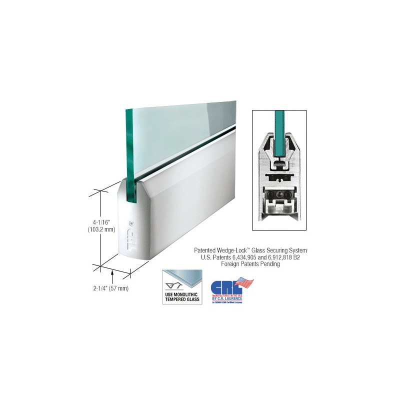 Our innovative glass entrance system, the CRL Wedge-Lock® Door Rail System features the exclusive CRL Wedge-Lock® Securing System (U.S. Patents 6,434,905 and 6,912,818 B2, Canadian Patent 2,419,706, and European Patent No. EP 1 404 939 B1). A totally new concept for securing the glass in the door rail. It works by applying pressure from the bottom of the door rail, using two glass retaining aluminum extrusions via a flat stainless steel bar. As this bar is pulled down with socket head cap bolts, pressure is applied to the glass retaining aluminum extrusions. The bottom of the extrusions are at an angle and fit into an angled groove in the door rail. As the glass retaining extrusions are being pulled down, the angled wedge in the door rail also pulls the glass retaining extrusions together. This action, along with our specially designed door retaining gasket, creates a tremendous amount of force (more than 900 lbs.) in our 9" (228.6 mm) Corner Rail. That's 100 lbs. per inch. Imagine how much force is created in our full length 35-3/4" (908 mm) Door Rails!