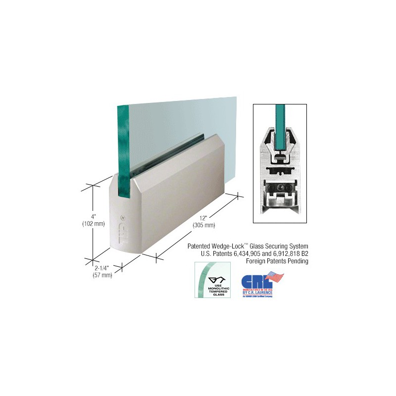 Our innovative glass entrance system, the CRL Wedge-Lock® Door Rail System features the exclusive CRL Wedge-Lock® Securing System (U.S. Patents 6,434,905 and 6,912,818 B2, Canadian Patent 2,419,706, and European Patent No. EP 1 404 939 B1). A totally new concept for securing the glass in the door rail. It works by applying pressure from the bottom of the door rail, using two glass retaining aluminum extrusions via a flat stainless steel bar. As this bar is pulled down with socket head cap bolts, pressure is applied to the glass retaining aluminum extrusions. The bottom of the extrusions are at an angle and fit into an angled groove in the door rail. As the glass retaining extrusions are being pulled down, the angled wedge in the door rail also pulls the glass retaining extrusions together. This action, along with our specially designed door retaining gasket, creates a tremendous amount of force (more than 900 lbs.) in our 9" (228.6 mm) Corner Rail. That's 100 lbs. per inch. Imagine how much force is created in our full length 35-3/4" (908 mm) Door Rails!