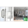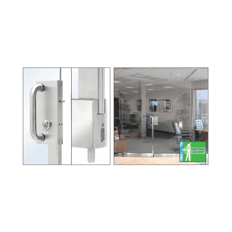 This CRL 4" x 10" Center Lock has two throws, an extended throw that latches through the bottom door rail into the floor, and a horizontal throw that latches into the jamb or adjacent Glass Mount Keeper. It is completely activated at a comfortable distance above the floor utilizing a built-in Adams Rite® 1860-02 Lock with a modified extension rod allowing the throw to enter the floor. A small edge channel that travels down from the Center Lock to the bottom rail conceals the extension rod. It includes an 8" (203 mm) back-to-back "D" Handle, a Thumbturn on the inside, and a Keyed Cylinder on the outside.