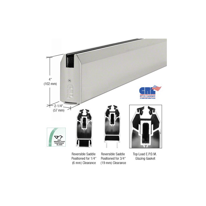 The CRL 4" (102 mm) Tapered Sidelite Rail is commonly used in office and storefront applications to secure fixed glass panels. Since the profile matches our Door Rails, these Sidelite Rails can be used top and bottom for a matching look, or with a variety of smaller configuration U-Channels. Glass is installed easily with the 'lift and drop' method using our 4" (102 mm) Aluminum and Neoprene Setting Blocks. Glass is secured with a Top Load EPDM Roll-in Glazing Gasket that eliminates the messy application of silicone sealant. Also available in this size are our 4" (102 mm) Square Sidelite Rails to match our Square Door Rails.