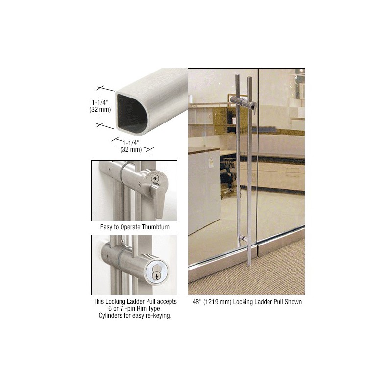 CRL Designer Series "D" Shape Locking Ladder Pulls have a fully concealed deadbolt locking mechanism that locks into the floor. Simply turn a key or thumbturn located at a comfortable height above the finished floor to lock or unlock your doors. Supplied with our standard 7-pin Rim Cylinder with interchangeable core, that can be used as the final cylinder or as a temporary, and is easily replaced. If staying with the 7-pin format, just remove the core, have it re-keyed or replace it with a new one. If proprietary 6-pin Cylinders are required, simply remove the entire Rim Cylinder provided and replace with the proper Rim Cylinder of your choice. Ladder Pulls will accept most standard manufactured Rim type cylinders.