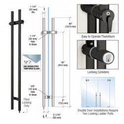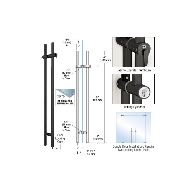 Our CRL LLPA Locking Ladder Pulls have a fully concealed deadbolt locking mechanism. No need to bend, simply turn a key or thumbturn located at a comfortable height above the finished floor to lock or unlock your doors. These Locking Ladder Pulls are intended for use with glass doors made from 1/2" to 3/4" (12 to 19 mm) thick tempered glass. They lock into the floor only, and are available in brushed and polished stainless steel.