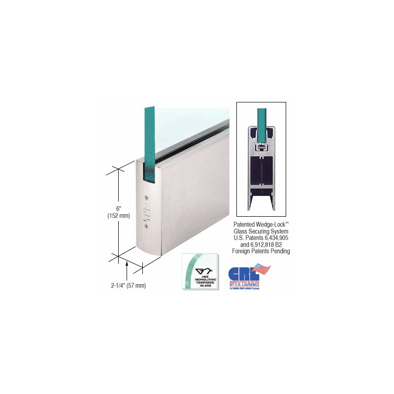An innovative new glass entrance system, the CRL Wedge-Lock® Door Rail System features the exclusive CRL Wedge-Lock® Securing System (U.S. Patents 6,434,905 and 6,912,818 B2, Canadian Patent 2,419,706, and European Patent No. EP 1 404 939 B1), a totally new concept for securing the glass in the door rail. It works by applying pressure from the bottom of the door rail, using two glass retaining aluminum extrusions via a flat stainless steel bar. As this bar is pulled down with socket head cap bolts, pressure is applied to the glass retaining aluminum extrusions. The bottom of the extrusions are at an angle and fit into an angled groove in the door rail. As the glass retaining extrusions are being pulled down, the angled wedge in the door rail also pulls the glass retaining extrusions together. This action, along with our specially designed door retaining gasket, creates a tremendous amount of force (more than 900 lbs.) in our 9" (228.6 mm) Corner Rail. That's 100 lbs. per inch. Imagine how much force is created in our full length Door Rails!