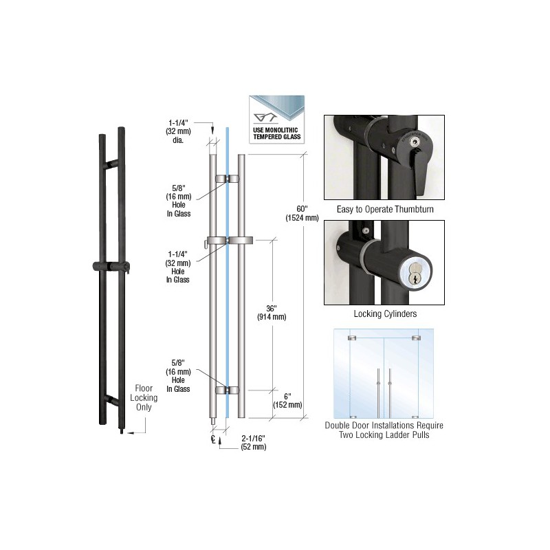 Our CRL LLPA Locking Ladder Pulls have a fully concealed deadbolt locking mechanism. No need to bend, simply turn a key or thumbturn located at a comfortable height above the finished floor to lock or unlock your doors. These Locking Ladder Pulls are intended for use with glass doors made from 1/2" to 3/4" (12 to 19 mm) thick tempered glass. They lock into the floor only, and are available in brushed and polished stainless steel.