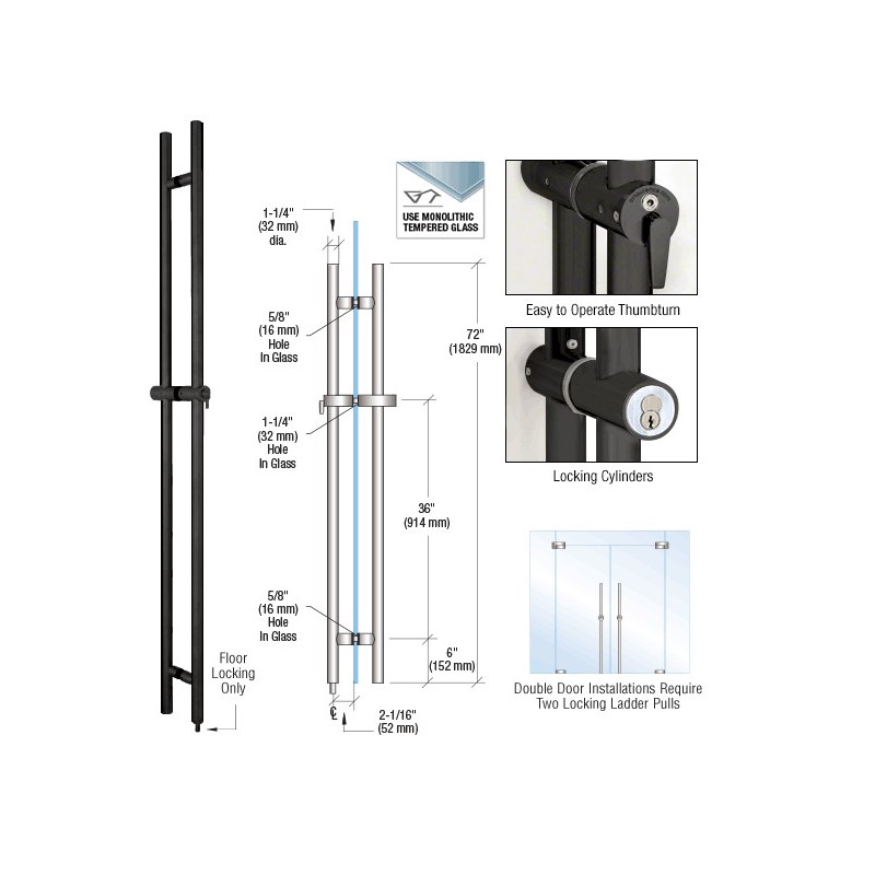 Our CRL LLPA Locking Ladder Pulls have a fully concealed deadbolt locking mechanism. No need to bend, simply turn a key or thumbturn located at a comfortable height above the finished floor to lock or unlock your doors. These Locking Ladder Pulls are intended for use with glass doors made from 1/2" to 3/4" (12 to 19 mm) thick tempered glass. They lock into the floor only, and are available in brushed and polished stainless steel.