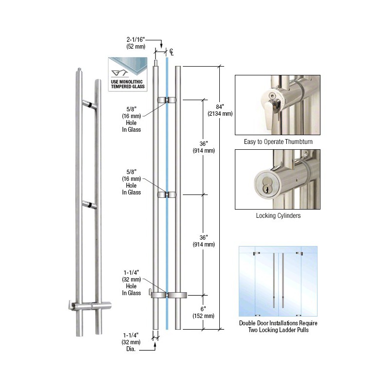 Our CRL LLPUA Series Upward Locking Ladder Pulls have a fully concealed deadbolt locking mechanism that locks into the ceiling, not into the floor. No need to bend or reach to lock or unlock the door, simply turn a key or thumbturn located at a comfortable height above the finished floor. Intended for use with 1/2" to 3/4" (12 to 19 mm) thick tempered glass doors, they are available in brushed and polished stainless steel.