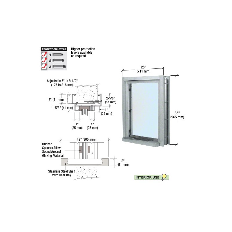 C01W2436A CRL Satin Anodized 28" Wide Bullet Resistant Interior Window With Surround Sound and 12" Shelf With Deal Tray