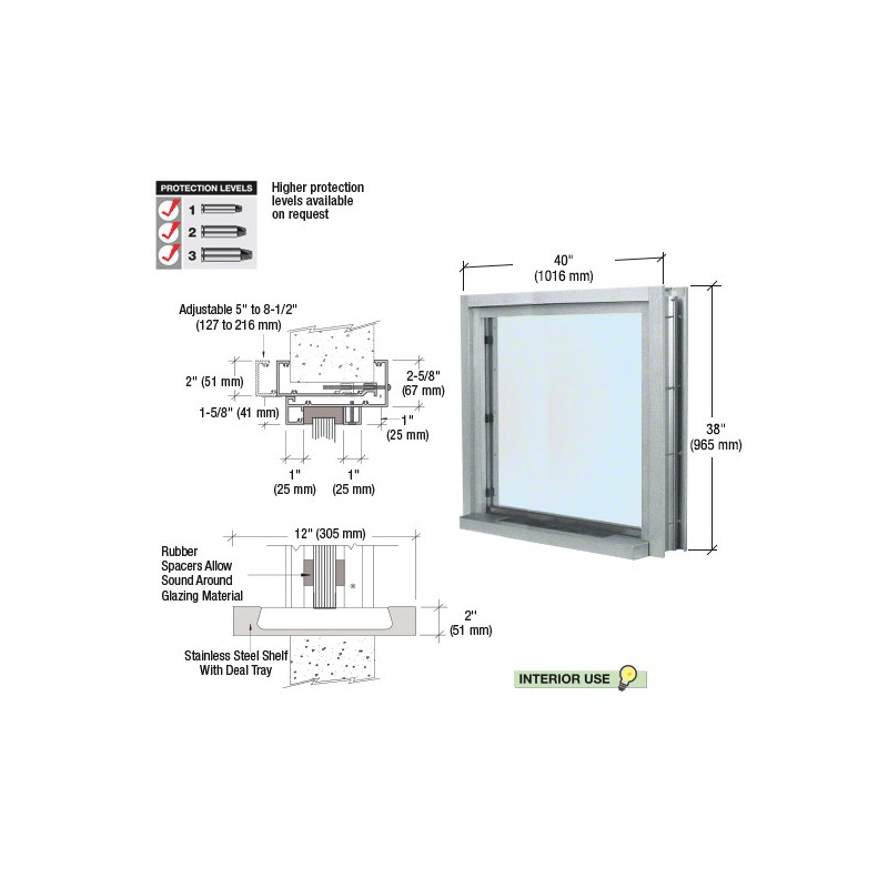 C01W3636A CRL Satin Anodized 40" Wide Bullet Resistant Interior Window with Surround and 12" Shelf with Deal Tray
