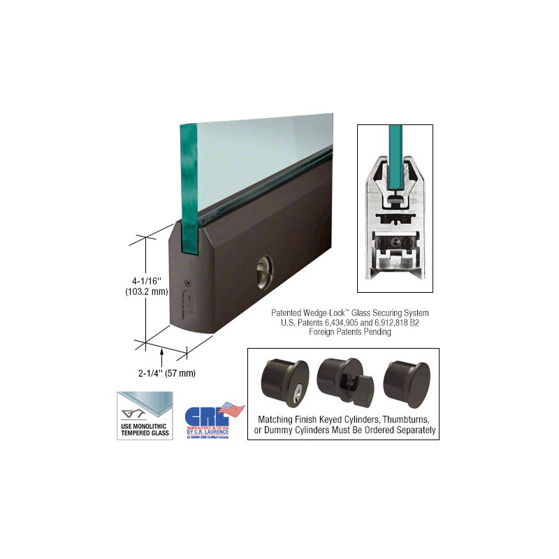 Our innovative glass entrance system, the CRL Wedge-Lock® Door Rail System features the exclusive CRL Wedge-Lock® Securing System (U.S. Patents 6,434,905 and 6,912,818 B2, Canadian Patent 2,419,706, and European Patent No. EP 1 404 939 B1). A totally new concept for securing the glass in the door rail. It works by applying pressure from the bottom of the door rail, using two glass retaining aluminum extrusions via a flat stainless steel bar. As this bar is pulled down with socket head cap bolts, pressure is applied to the glass retaining aluminum extrusions. The bottom of the extrusions are at an angle and fit into an angled groove in the door rail. As the glass retaining extrusions are being pulled down, the angled wedge in the door rail also pulls the glass retaining extrusions together. This action, along with our specially designed door retaining gasket, creates a tremendous amount of force (more than 900 lbs.) in our 9" (228.6 mm) Corner Rail. That's 100 lbs. per inch. Imagine how much force is created in our full length 35-3/4" (908 mm) Door Rails!