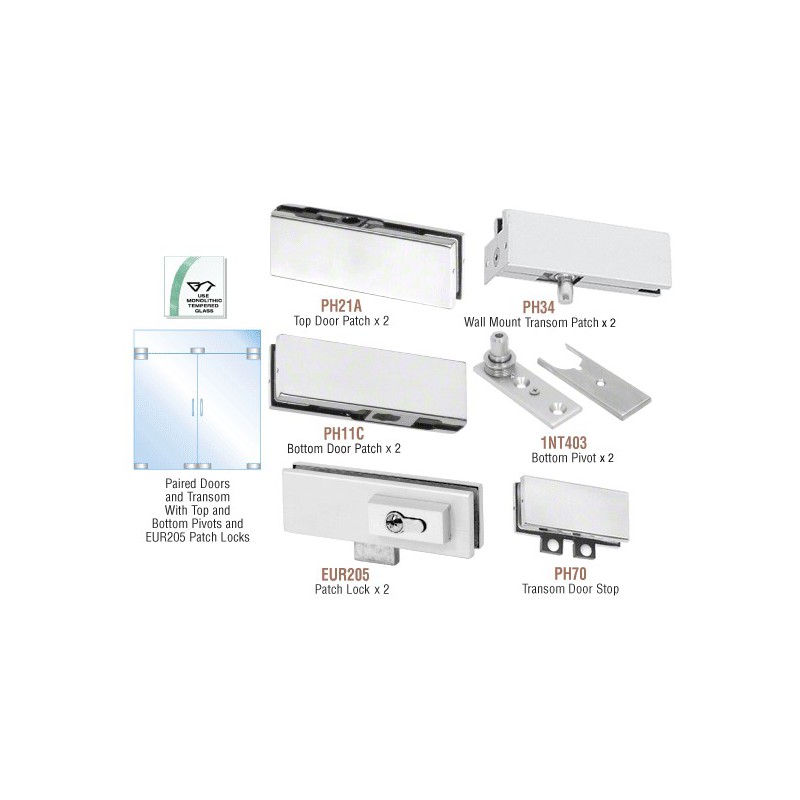 CRL PHE6 European Double Door Kits come with all the hardware to complete a pair of free-swinging doors with fixed transom, (except glass and additional supports for the fixed transom). Pivot setback is 2-9/16" (65 mm). Floor closer with tapered spindle (ordered separately) may be used with this Kit.