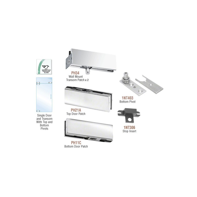CRL PHE3 European Patch Door Kits come with all the hardware to complete a single free-swinging door with fixed transom, (except glass and additional supports for the fixed transom). Pivot setback is 2-9/16" (65 mm). Floor closers with tapered spindles (ordered separately) may be used with this Kit.