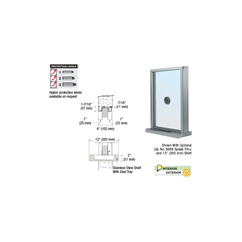 N1EW12A CRL Satin Anodized Aluminum Narrow Inset Frame Exterior Glazed Exchange Window with 12" Shelf and Deal Tray