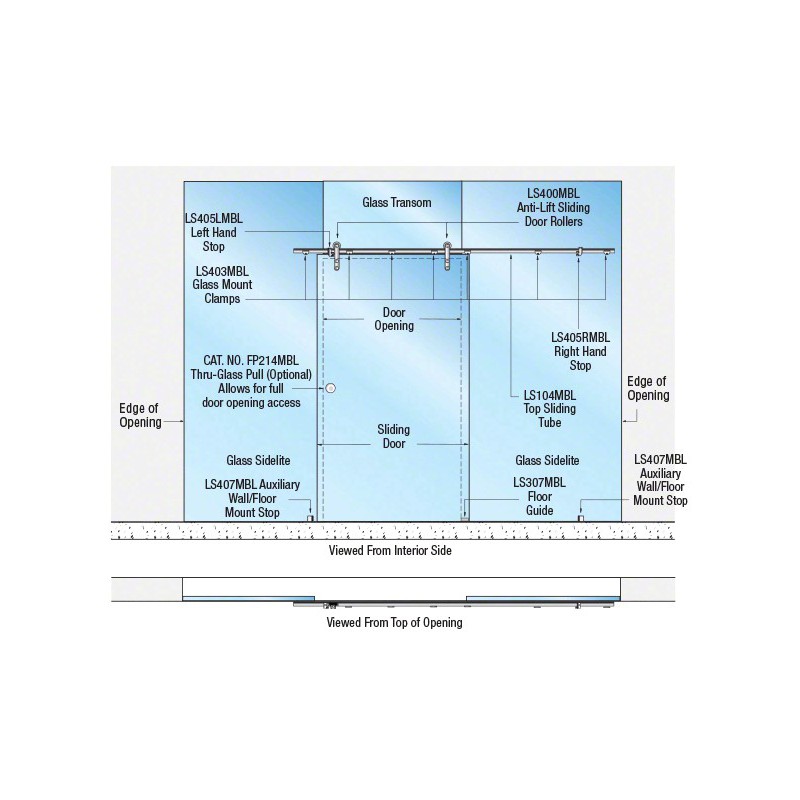 The CRL Laguna Series Glass Mount Single Slider Kit contains all the components you will need (except the tempered glass) to complete this style of installation. This model is used in applications where you are attaching a single sliding door in an 'all-glass' opening where you have a wall on one end next to the door, a glass transom above the door, and a fixed glass panel on the other side of the door. Bi-parting double doors are not possible for this application.