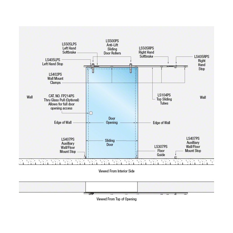 The CRL Laguna Series Wall Mount Single Slider with Softbrake Kit contains all the components you will need (except the tempered glass) to complete a single door installation. The Softbrake braking system helps to control the last 2-1/4" (57 mm) of travel. This model is used in applications where you are attaching a single sliding door to the inside face of a sufficiently reinforced wall.