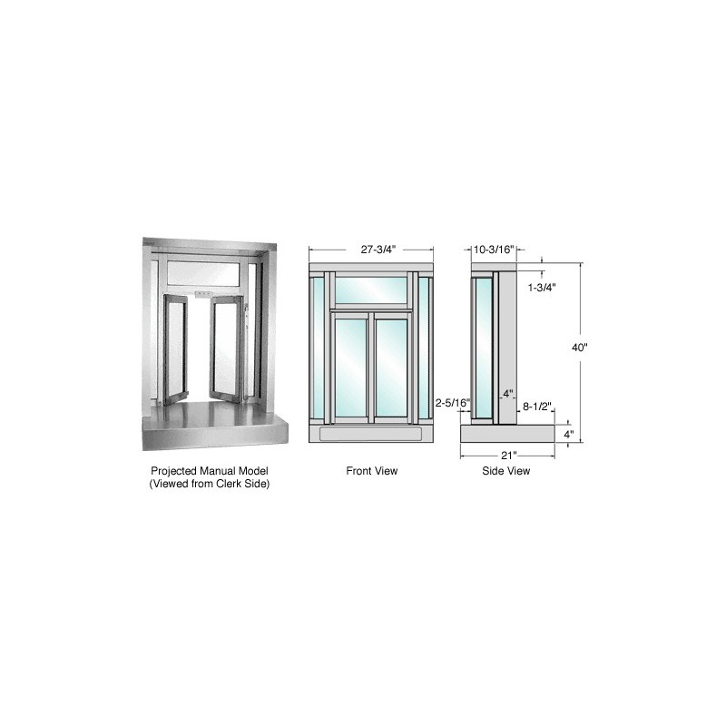 CRL Bi-Fold Service Windows are perfect anywhere a high quality bi-folding window is required. Features include two panels that simultaneously open outward towards the customer, and a burglar bar for extra security. Projected and Flush Mount models are available in two different configurations: MANUAL- Both panels move simultaneously as either panel is manually operated. SEMI-AUTOMATIC - Opening the window is achieved by pushing on the hip activated slide bar. Step away from the window and the two panels automatically close. Custom sizes and custom paint colors are available by special order. For additional information, contact CRL Technical Sales Department.