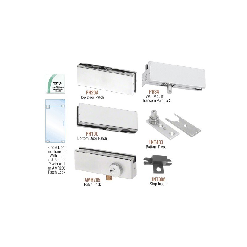 CRL PHA3 North American Patch Door Kits come with all the hardware to complete a single free-swinging door with fixed transom, except glass and additional supports for the fixed transom. Pivot setback is 2-3/4" (70 mm). Floor closers with tapered spindles (ordered separately) may be used with this kit.