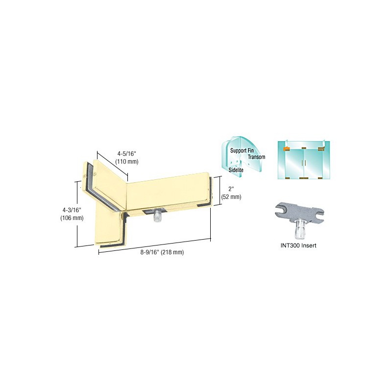 The CRL Left Hand Sidelite Mounted Transom Patch with Support Fin Bracket is used to support a transom from a sidelite glass panel. It comes with a INT300 Insert for mounting a door with a CRL PH20A or PH21A Top Door Patch Fitting. For single doors, the insert can be removed on the non-hinged side allowing for a double swinging door. A INT306 Transom Patch Door Stop Insert can be used to create a one way door. Also, a INT305 Transom Patch Keeper Insert can be installed for use with an AMR205 Lock when used for a top of the door installation. The support fin glass should be sized in accordance with approved design criteria (refer to GANA or Manufacturers Manual) and secured to the ceiling with a PH92 Ceiling Mounted Support Fin Bracket.