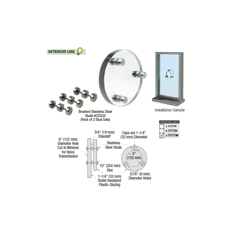 CRL Clear Vision Bullet Resistant Speak-Thrus offer two levels of protection, and provide a clear field of vision. The units are easy-to-install, and designed for use with plastic glazing materials only. Drill a 6" (152 mm) diameter hole in the bullet resistant window, surrounded by three 5/16" (8 mm) holes spaced at 120 degrees on a 7-1/2" (190 mm) diameter (template included). Secure the 10" (254 mm) Acrylic or Lexgard® Disc using the Stainless Steel Studs provided with the unit. The space between the window and disc allows for clear voice transmission. The 10" (254 mm) disc provides enough overlap to prevent direct entry of projectiles. Cat. No. CDS3S Studs Sets are also available for customers preferring to fabricate their own discs. Intended for interior use only.