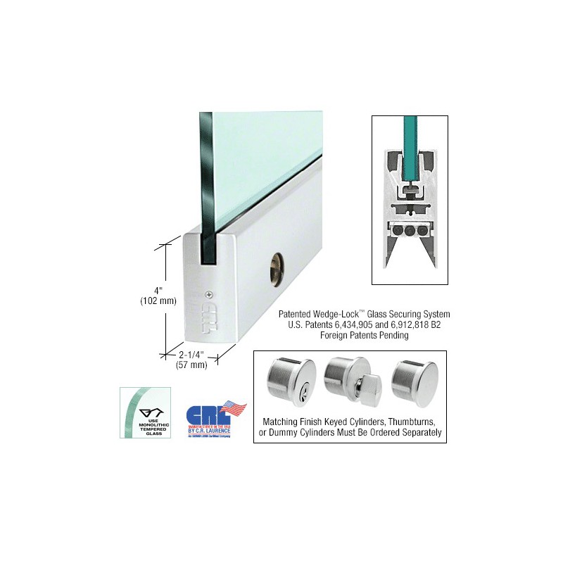 Our innovative glass entrance system, the CRL Wedge-Lock® Door Rail System features the exclusive CRL Wedge-Lock® Securing System (U.S. Patents 6,434,905 and 6,912,818 B2, Canadian Patent 2,419,706, and European Patent No. EP 1 404 939 B1). A totally new concept for securing the glass in the door rail. It works by applying pressure from the bottom of the door rail, using two glass retaining aluminum extrusions via a flat stainless steel bar. As this bar is pulled down with socket head cap bolts, pressure is applied to the glass retaining aluminum extrusions. The bottom of the extrusions are at an angle and fit into an angled groove in the door rail. As the glass retaining extrusions are being pulled down, the angled wedge in the door rail also pulls the glass retaining extrusions together. This action, along with our specially designed door retaining gasket, creates a tremendous amount of force (more than 900 lbs.) in our 9" (228.6 mm) Corner Rail. That's 100 lbs. per inch. Imagine how much force is created in our full length 35-3/4" (908 mm) Door Rails!