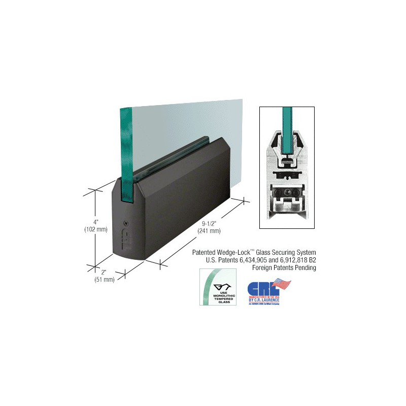 Our innovative glass entrance system, the CRL Wedge-Lock® Door Rail System features the exclusive CRL Wedge-Lock® Securing System (U.S. Patents 6,434,905 and 6,912,818 B2, Canadian Patent 2,419,706, and European Patent No. EP 1 404 939 B1). A totally new concept for securing the glass in the door rail. It works by applying pressure from the bottom of the door rail, using two glass retaining aluminum extrusions via a flat stainless steel bar. As this bar is pulled down with socket head cap bolts, pressure is applied to the glass retaining aluminum extrusions. The bottom of the extrusions are at an angle and fit into an angled groove in the door rail. As the glass retaining extrusions are being pulled down, the angled wedge in the door rail also pulls the glass retaining extrusions together. This action, along with our specially designed door retaining gasket, creates a tremendous amount of force (more than 900 lbs.) in our 9" (228.6 mm) Corner Rail. That's 100 lbs. per inch. Imagine how much force is created in our full length 35-3/4" (908 mm) Door Rails!