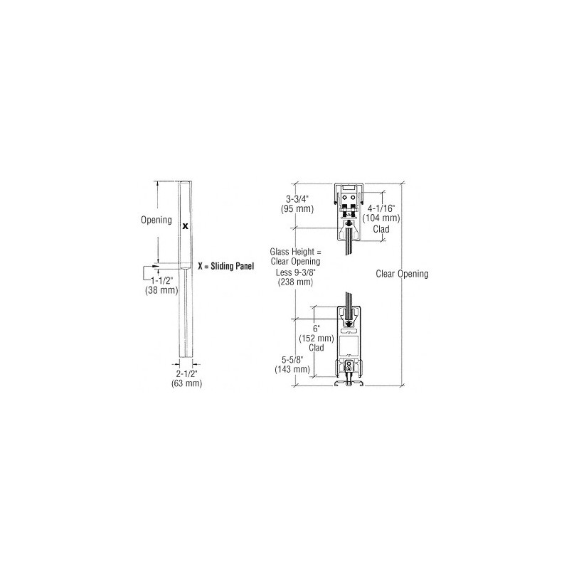 The CRL SDR Bottom Rolling Sliding Door System with 4" (102 mm) Square Top Rails and 6" (152 mm) Square Bottom Rails, utilizes our popular Wedge-Lock® Glass Securing System found in the DR4S and DR6S Series Door Rails. They can be ordered with or without locks in the bottom rail, and are custom fabricated to your specifications. Maximum door width is 48" (1.22 m); maximum door height is 108" (2.74 m), with a maximum weight not to exceed 234 pounds (106 kg).