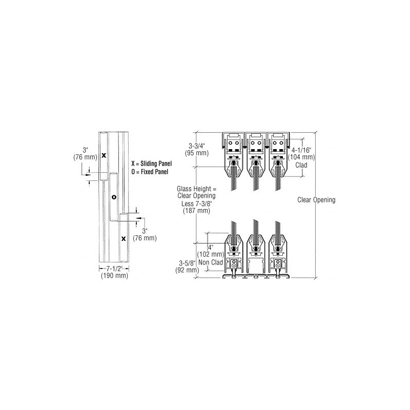 The CRL SDR Bottom Rolling Sliding Door System with 4" (102 mm) Tapered Rails Top and Bottom utilizes our popular Wedge-Lock® Glass Securing System. The DR4T Series Door Rails are used for all door and fixed panels, and are custom fabricated to your specifications. The doors can be ordered with or without locks in the bottom rail. Maximum door width is 48" (1.22 m); maximum door height is 108" (2.74 m), with a maximum weight not to exceed 234 pounds (106 kg).