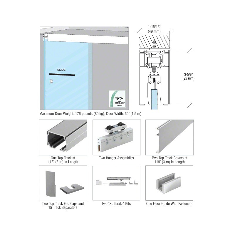 This configuration of the CRL51 Series Slider is used for single door applications where the top track mounts to a structural ceiling. Kit includes two Top Track Covers to conceal the Top Track and Hanger Assemblies, making for an attractive yet simple installation. Pull hardware ordered separately. One "Softbrake" is required for each direction of travel to be controlled per panel. Minimum sliding panel width of 25-9/16" (650 mm) for control in a single direction; 31-1/2" (800 mm) for control in both directions of travel.