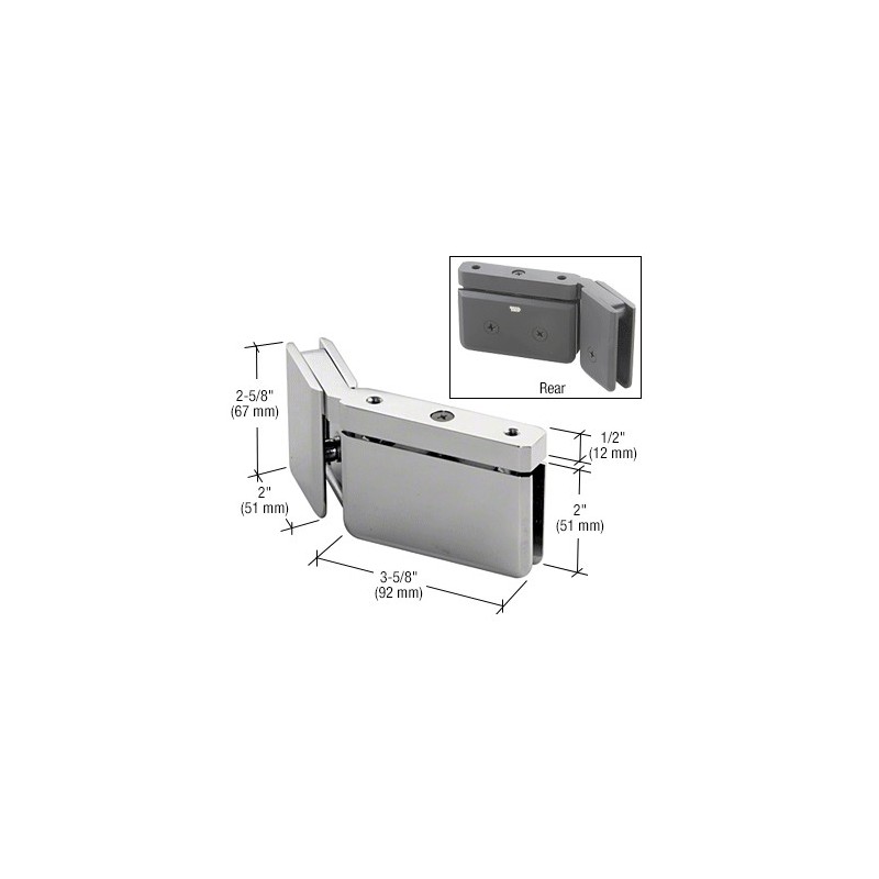 The combination of this CRL 135 Degree Prima Hinge with U-Clamp at the top of the enclosure allows the installer to mount a shower door next to an adjacent 135 degree fixed panel without a header. The same may be done at the bottom of the door, or a standard PPH01 Model may be used with the door, with a separate U-Clamp or U-Channel used at the bottom of the panel. Stocked in six popular finishes, and used with 3/8" or 5/16" (10 or 8 mm) thick tempered safety glass.