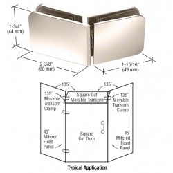 Ces pinces pour imposte mobile CRL, 135°, sont dotées de bords en onglets esthétiques et assorties aux charnières du même style. Pour assembler deux panneaux fixes en verre à 135°. Données techniques :
