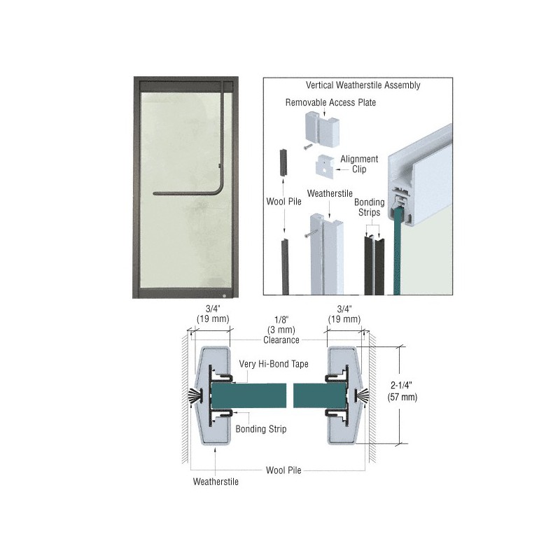 Les kits de portes simples CRL contiennent deux montants résistants aux intempéries dotés d'un joint d'étanchéité en velours en laine de 2,97 m (117 po) de long, quatre baguettes de fixation de 2,97 m (117 po) de long avec bande ultra-adhésive, quatres plaques d'accès démontables de 38 mm (1-1/2 po) de haut avec taquets d'alignement et instructions d'installation. Des dimensions sur mesure sont disponibles sur commande jusqu'à 2,97 m (117 po).