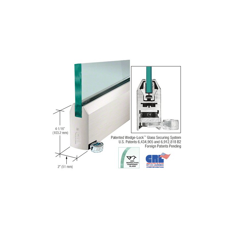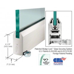 An innovative new glass entrance system, the CRL Wedge-Lock Door Rail System features the exclusive CRL Wedge-Lock Securing System (U.S. Patents 6,434,905 and 6,912,818 B2, Canadian Patent 2,419,706, and European Patent No. EP 1 404 939 B1), a totally new concept for securing the glass in the door rail. It works by applying pressure from the bottom of the door rail, using two glass retaining aluminum extrusions via a flat stainless steel bar. As this bar is pulled down with socket head cap bolts, pressure is applied to the glass retaining aluminum extrusions. The bottom of the extrusions are at an angle and fit into an angled groove in the door rail. As the glass retaining extrusions are being pulled down, the angled wedge in the door rail also pulls the glass retaining extrusions together. This action, along with our specially designed door retaining gasket, creates a tremendous amount of force (more than 900 pounds) in our 9" (228.6 mm) Corner Rail. That's 100 pounds per inch. Imagine how much force is created in our full length 35-3/4" (908 mm) Door Rails!