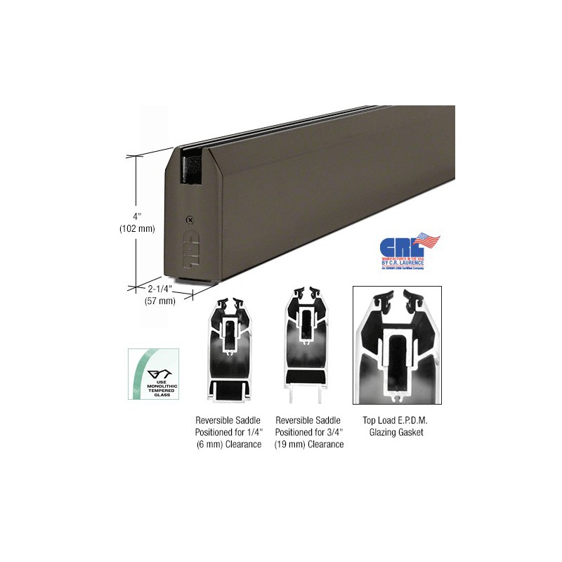 Le profil effilé des profilés de la partition fixe CRL est tout à fait assorti à nos profilés de porte à système de verrouillage, style effilé, de 101,6 mm (4 po). Disponibles dans plusieurs finis de 3,05 ou 6,10 m (120 ou 240 po), notre barre de seuil réversible permet de les adapter à des hauteurs au sol et à des seuils de 13 mm (1/2 po) de haut. Utilisez les profilés de partitions fixes seuls pour vos profilés supérieurs, et utilisez-les avec nos cales d'assise en aluminium et néoprène pour soulever le verre dans le profilé supérieur et l'abaisser dans le profilé inférieur. Cela vous permet de fixer le verre de 14 mm (9/16 po) dans les profilés supérieur et inférieur. Finalisez l'installation à l'aide des joints de calfeutrement en EPDM à pression et des embouts avec fini assorti. Un élément par kit.