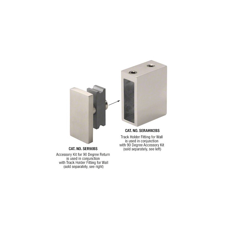 Le kit d'accessoires 90 degrés permet d'installer des retours de 90 degrés avec notre système de portes coulissantes Serenity. Vendue séparément du kit 180 degrés, cette pièce de 38,1 mm (1-1/2 po) de long et 19 mm (3/4 po) de large est livrée avec la vis nécessaire pour fixer le support mural. Le kit d'accessoires 90 degrés est disponible en acier inox poli ou brossé.