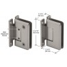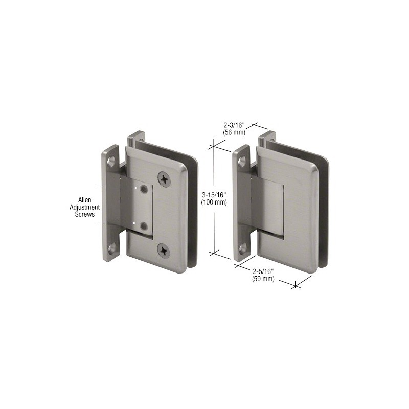 Les CRL charnières professionnelles réglables CRL de la série Cologne sont conçues pour une épaisseur de verre trempé de sécurité de 10 à 12 mm (3/8 à 1/2 po). Les deux styles, y compris platine murale et verre-verre, permettent une véritable souplesse de conception. Le concepteur/l'installateur peut alors laisser libre cours à son imagination pour créer des cabines personnalisées. Les possibilités de réglage de la très prisée série Cologne l'ont hissée à un niveau supérieur. Le réglage permettant d'obtenir l'angle souhaité (jusqu'à 90°) s'effectue après installation de la porte. Une fois la porte installée, il vous suffit de desserrer les vis hexagonales pour orienter la porte dans la position de fermeture souhaitée. Serrez les vis hexagonales dans le nouvel emplacement du dispositif de centrage automatique. La porte peut pivoter de 90° vers l'intérieur et l'extérieur (la position de l'angle est réglée en usine, mais peut être ajustée pour limiter la rotation à 90° dans un sens ou dans l'autre). Pour les portes à huisserie translucide s'ouvrant uniquement vers l'extérieur, vous pouvez régler la charnière de manière à fermer la porte de 5° à l'intérieur de la douche. Lors de sa fermeture, la porte s'encastre alors dans l'huisserie. Si vous utilisez deux charnières avec une épaisseur de verre de 10 à 12 mm (3/8 à 1/2 po), veillez à choisir une porte de 50 kgs (110 lb) et de 914 mm (36 po) de large au maximum. Si vous utilisez trois charnières avec une épaisseur de verre de 10 à 12 mm (3/8 à 1/2 po), veillez à choisir une porte de 63 kgs (140 lb) et de 914 mm (36 po) de large au maximum. Données techniques :
