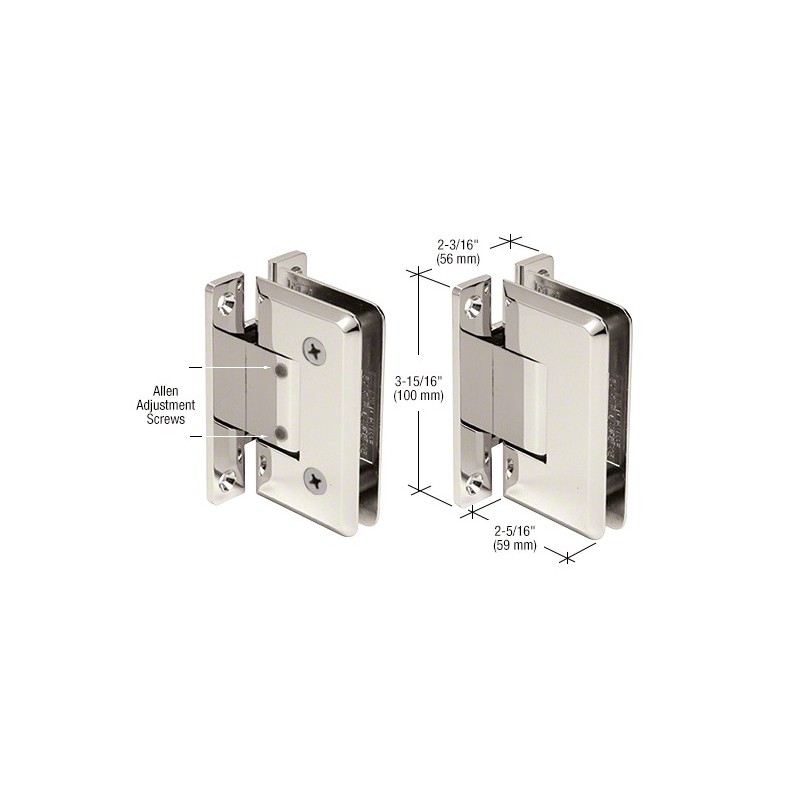 Les CRL charnières professionnelles réglables CRL de la série Cologne sont conçues pour une épaisseur de verre trempé de sécurité de 10 à 12 mm (3/8 à 1/2 po). Les deux styles, y compris platine murale et verre-verre, permettent une véritable souplesse de conception. Le concepteur/l'installateur peut alors laisser libre cours à son imagination pour créer des cabines personnalisées. Les possibilités de réglage de la très prisée série Cologne l'ont hissée à un niveau supérieur. Le réglage permettant d'obtenir l'angle souhaité (jusqu'à 90°) s'effectue après installation de la porte. Une fois la porte installée, il vous suffit de desserrer les vis hexagonales pour orienter la porte dans la position de fermeture souhaitée. Serrez les vis hexagonales dans le nouvel emplacement du dispositif de centrage automatique. La porte peut pivoter de 90° vers l'intérieur et l'extérieur (la position de l'angle est réglée en usine, mais peut être ajustée pour limiter la rotation à 90° dans un sens ou dans l'autre). Pour les portes à huisserie translucide s'ouvrant uniquement vers l'extérieur, vous pouvez régler la charnière de manière à fermer la porte de 5° à l'intérieur de la douche. Lors de sa fermeture, la porte s'encastre alors dans l'huisserie. Si vous utilisez deux charnières avec une épaisseur de verre de 10 à 12 mm (3/8 à 1/2 po), veillez à choisir une porte de 50 kgs (110 lb) et de 914 mm (36 po) de large au maximum. Si vous utilisez trois charnières avec une épaisseur de verre de 10 à 12 mm (3/8 à 1/2 po), veillez à choisir une porte de 63 kgs (140 lb) et de 914 mm (36 po) de large au maximum. Données techniques :