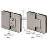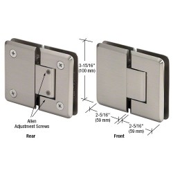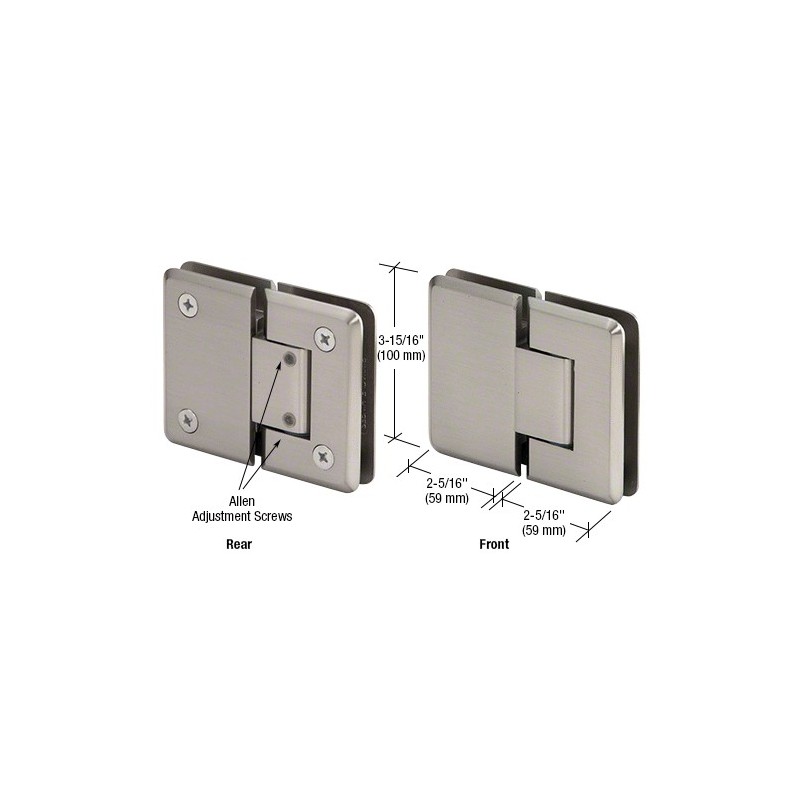 Les CRL charnières professionnelles réglables CRL de la série Cologne sont conçues pour une épaisseur de verre trempé de sécurité de 10 à 12 mm (3/8 à 1/2 po). Les deux styles, y compris platine murale et verre-verre, permettent une véritable souplesse de conception. Le concepteur/l'installateur peut laisser libre cours à son imagination pour créer des cabines personnalisées. Les possibilités de réglage de la très prisée série Cologne l'ont hissée à un niveau supérieur. Le réglage permettant d'obtenir l'angle souhaité (jusqu'à 90°) s'effectue après installation de la porte. Une fois la porte installée, il vous suffit de desserrer les vis hexagonales pour orienter la porte dans la position de fermeture souhaitée. Serrez les vis hexagonales dans le nouvel emplacement du dispositif de centrage automatique. La porte peut pivoter de 90° vers l'intérieur et l'extérieur (la position de l'angle est réglée en usine, mais peut être ajustée pour limiter la rotation à 90° dans un sens ou dans l'autre). Pour les portes à huisserie translucide s'ouvrant uniquement vers l'extérieur, vous pouvez régler la charnière de manière à fermer la porte de 5° à l'intérieur de la douche. Lors de sa fermeture, la porte s'encastre alors dans l'huisserie. Si vous utilisez deux charnières avec une épaisseur de verre de 10 à 12 mm (3/8 à 1/2 po), veillez à choisir une porte de 50 kgs (110 lb) et de 914 mm (36 po) de large au maximum. Si vous utilisez trois charnières avec une épaisseur de verre de 10 à 12 mm (3/8 à 1/2 po), veillez à choisir une porte de 63 kgs (140 lb) et de 914 mm (36 po) de large au maximum. Données techniques :