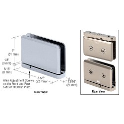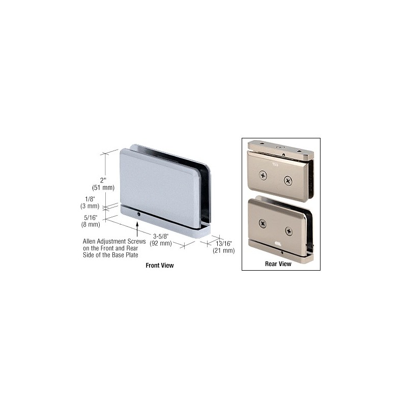 La nouvelle charnière réglable série Prima permet une installation des charnières du haut et du bas encore plus facile qu'auparavant. Maintenant, vous pouvez effectuer des réglages jusqu'à 5º de chaque côté pour aligner la porte après l'installation. Il suffit de desserrer les petites vis creuses à l'avant et à l'arrière de la plaque de base pour régler la porte à la position souhaitée. Ensuite serrer les vis pour assurer la même position de la porte à chaque fois. REMARQUE : Incompatible avec les systèmes de linteaux. Si vous utilisez deux charnières avec une épaisseur de verre de 8 ou 10 mm (5/16 ou 3/8 po), veillez à choisir une porte au poids n'excédant pas 45 kg (100 livres) et à largeur maximum de 787 mm (31 po).