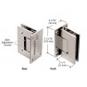Les CRL charnières professionnelles réglables CRL de la série Vienna sont conçues pour une épaisseur de verre trempé de sécurité de 10 à 12 mm (3/8 à 1/2 po). Les deux styles, y compris platine murale et verre-verre, permettent une véritable souplesse de conception. Le concepteur/l'installateur peut alors laisser libre cours à son imagination pour créer des pare-douches personnalisés. Les possibilités de réglage de la très prisée série Vienna l'ont hissée à un niveau supérieur. Le réglage permettant d'obtenir l'angle souhaité (jusqu'à 90°) s'effectue après installation de la porte. Une fois la porte installée, il vous suffit de desserrer les vis hexagonales pour orienter la porte dans la position de fermeture souhaitée. Serrez les vis hexagonales dans le nouvel emplacement du dispositif de centrage automatique. La porte peut pivoter de 90° vers l'intérieur et l'extérieur (la position de l'angle est réglée en usine, mais peut être ajustée pour limiter la rotation à 90° dans un sens ou dans l'autre). Pour les portes à huisserie translucide s'ouvrant uniquement vers l'extérieur, vous pouvez régler la charnière de manière à fermer la porte de 5° à l'intérieur de la douche. Lors de sa fermeture, la porte s'encastre alors dans l'huisserie. Si vous utilisez deux charnières avec une épaisseur de verre de 10 à 12 mm (3/8 à 1/2 po), veillez à choisir une porte de 50 kgs (110 lb) et de 914 mm (36 po) de large au maximum. Si vous utilisez trois charnières avec une épaisseur de verre de 10 à 12 mm (3/8 à 1/2 po), veillez à choisir une porte de 63 kgs (140 lb) et de 914 mm (36 po) de large au maximum. Données techniques :