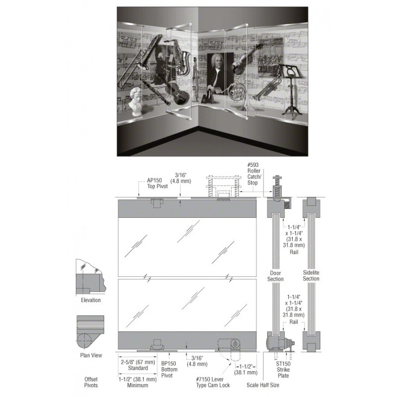 CRL-Blumcraft 1301 Series Display Case Doors and Sidelites provide the most clear viewable area of any heavy glass display case system available today. Top and bottom rails measure only 1-1/4" x 1-1/4" (32 x 32 mm), and are prepped for pivots and locks. We offer two systems, the 1301-SM Series with Surface Mounted Pivots, and the 1301-CM Series with Continuous Mounting Bars that house the pivots, locks, and catches. Both are available with center or offset pivots.