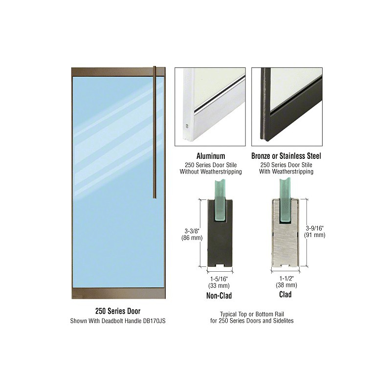 CRL-Blumcraft 250 Series Doors and Sidelites are supplied fully glazed with 1/2", 5/8" or 3/4" (12, 16 or 19 mm) tempered glass in clear, tinted or low-iron. Rails and Vertical Stiles are bonded to the glass, and can be prepped for a wide variety of door closer and pivot hardware. A bottom rail lock option is available, or the doors can come complete with any of our Egress Handles mounted on the door, ready-to-install in the opening.