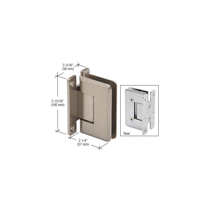 Les charnières professionnelles CRL de la série Cologne sont conçues pour une épaisseur de verre de 10 à 12 mm (3/8 à 1/2 po). Les nombreux styles, y compris platine murale et verre-verre, permettent une véritable souplesse de conception. Fabrication en laiton massif ; toutes les pièces mobiles (axes et ressorts) sont en acier inoxydable. Les charnières Cologne sont équipées d'un dispositif de centrage automatique et d'un axe d'articulation réversible à 5°. De plus, les axes d'articulation sur mesure sont conçus pour des installations avec décalage angulaire. Axe d'articulation réversible standard : chaque charnière Cologne est équipée d'un axe d'articulation réversible. Un côté de l'axe est prévu pour une configuration à 90°. Le côté opposé est prévu pour une configuration à 85°. Les modèles excentrés sont vendus avec l'axe pré réglé à 85° (fermeture de 5° supplémentaires vers l'intérieur de la douche). Pour activer l'autre côté, faites pivoter l'axe (sans le retourner). Les charnières Cologne standard sont pré-réglées à 90°. Axe d'articulation sur mesure : les axes d'articulation sur mesure (réf. V1EP1N) sont conçus pour des installations avec décalage angulaire. Si l'axe d'articulation réversible standard à 5° de la charnière ne permet pas de refermer la porte dans la position souhaitée, vous pouvez commander un axe d'articulation sur mesure en fonction de l'angle de votre choix (jusqu'à 45°). Si vous utilisez un axe d'articulation sur mesure, contactez notre service technico-commercial portes de douche. L'utilisation de l'axe d'articulation sur mesure peut conditionner la taille de votre verre et l'aspect esthétique de la cabine de douche. Si vous utilisez deux charnières avec une épaisseur de verre de 10 et 12 mm (3/8 et 1/2 po), veillez à choisir une porte de 50 kgs (110 lb) et de 914 mm (36 po) de large au maximum. Si vous utilisez trois charnières avec une épaisseur de verre de 10 et 12 mm (3/8 et 1/2 po), veillez à choisir une porte de 63 kgs (140 lb) et de 914 mm (36 po) de large au maximum. Données techniques :