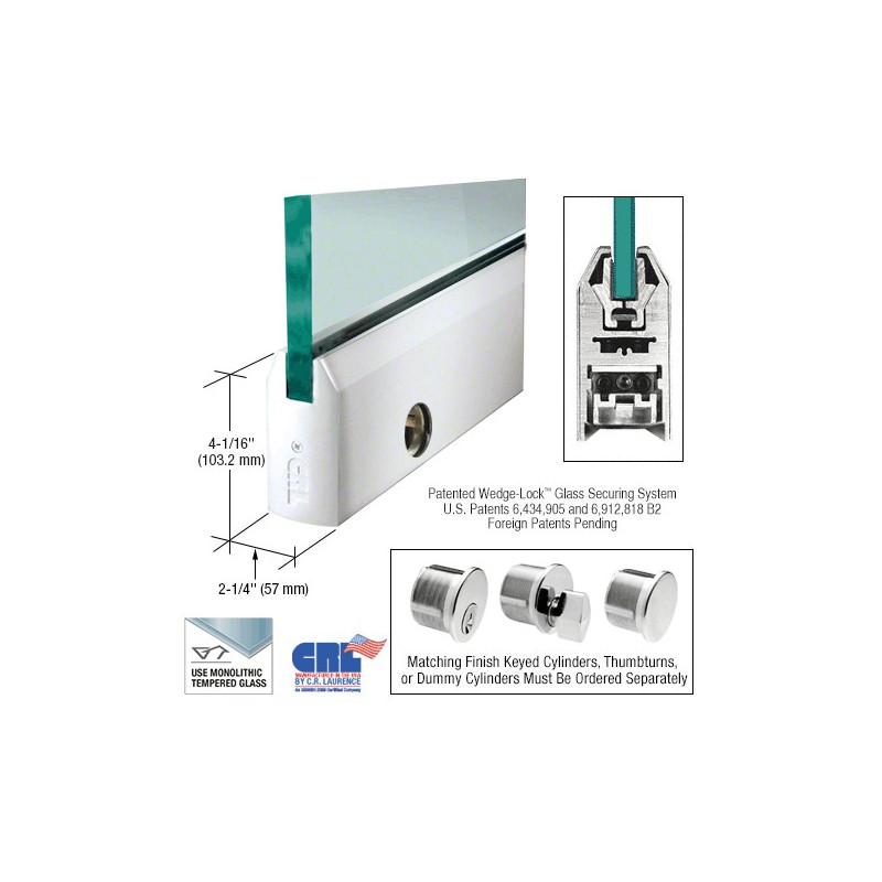Our innovative glass entrance system, the CRL Wedge-Lock Door Rail System features the exclusive CRL Wedge-Lock Securing System (U.S. Patents 6,434,905 and 6,912,818 B2, Canadian Patent 2,419,706, and European Patent No. EP 1 404 939 B1). A totally new concept for securing the glass in the door rail. It works by applying pressure from the bottom of the door rail, using two glass retaining aluminum extrusions via a flat stainless steel bar. As this bar is pulled down with socket head cap bolts, pressure is applied to the glass retaining aluminum extrusions. The bottom of the extrusions are at an angle and fit into an angled groove in the door rail. As the glass retaining extrusions are being pulled down, the angled wedge in the door rail also pulls the glass retaining extrusions together. This action, along with our specially designed door retaining gasket, creates a tremendous amount of force (more than 900 lbs.) in our 9" (228.6 mm) Corner Rail. That's 100 lbs. per inch. Imagine how much force is created in our full length 35-3/4" (908 mm) Door Rails!